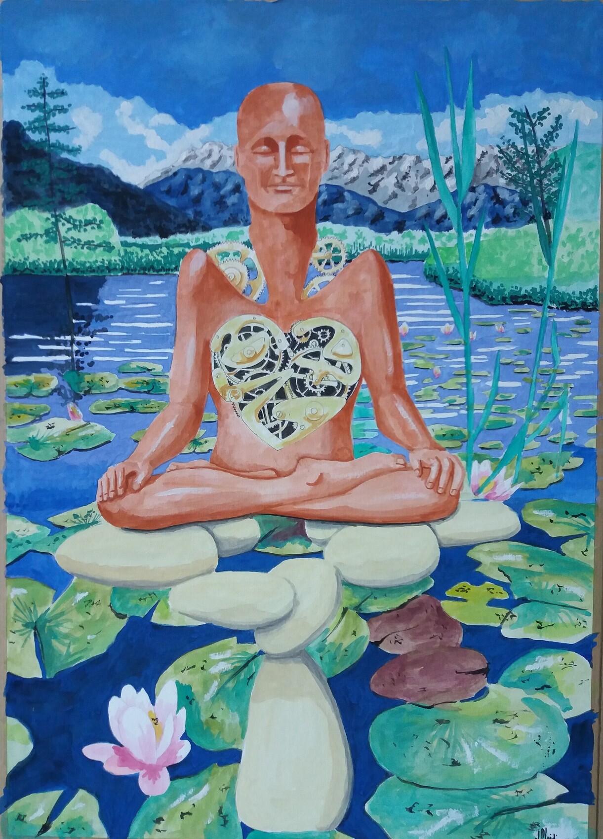 un automate avec son ossature de rouages est assis sur une élévation de pierres avec fond de lac et montagne