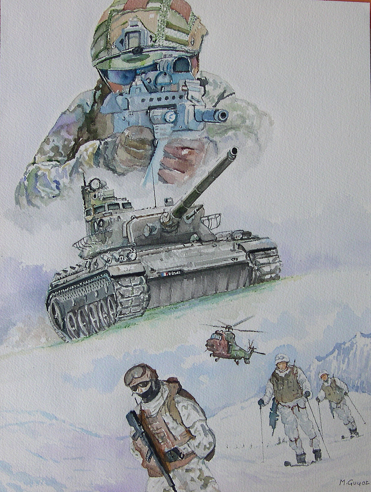 Opérations des forces spéciales de l'armée française. Char AMX30. Chasseurs alpins en intervention. Aquarelle 30x40cm.