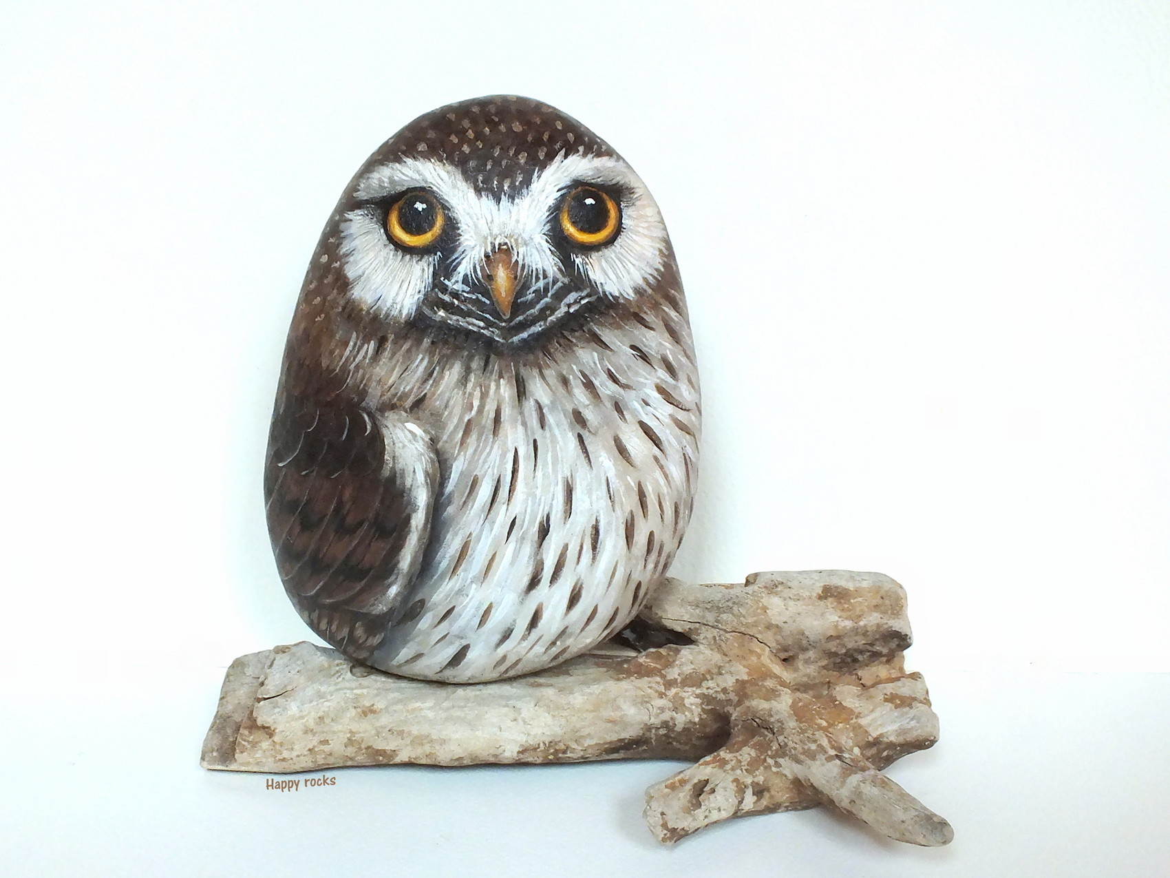 Chouette peinte à l'acrylique sur une pierre de 18 cm