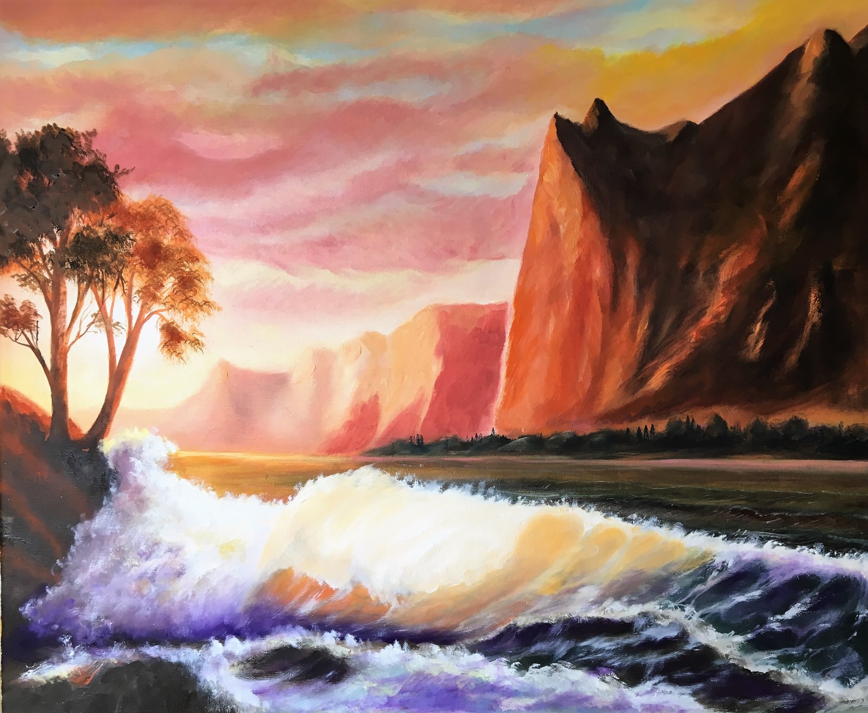 Lever de soleil sur soleil sur la calanque. Réalisé au pinceau. taille de la toile 55 x 46