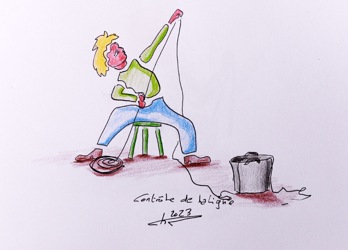 Contrôle de la ligne par un pêcheur avant sa prochaine campagne de pêche en bateau, crayon sur papier A4