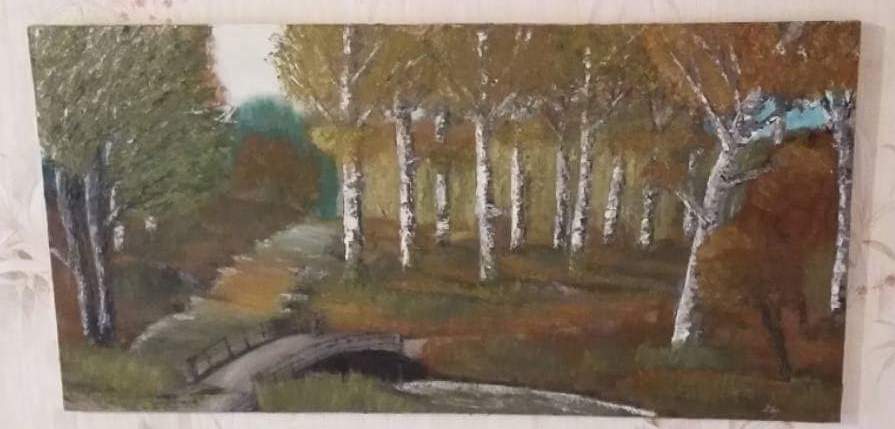 Peinture a huile sur toile lin sur châssis boisDimension 40x80cm. Technique utilisée mixte Représente une forêt bordée par une petite rivière en automne.