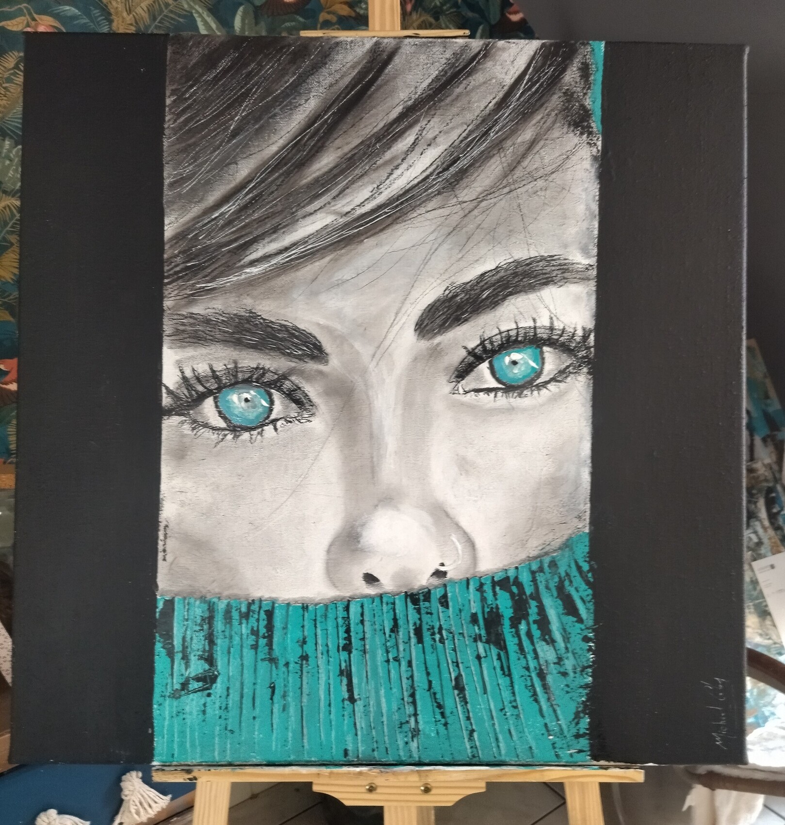 Dessin au fusain plus peinture acrylique sur toile de jute 80x80