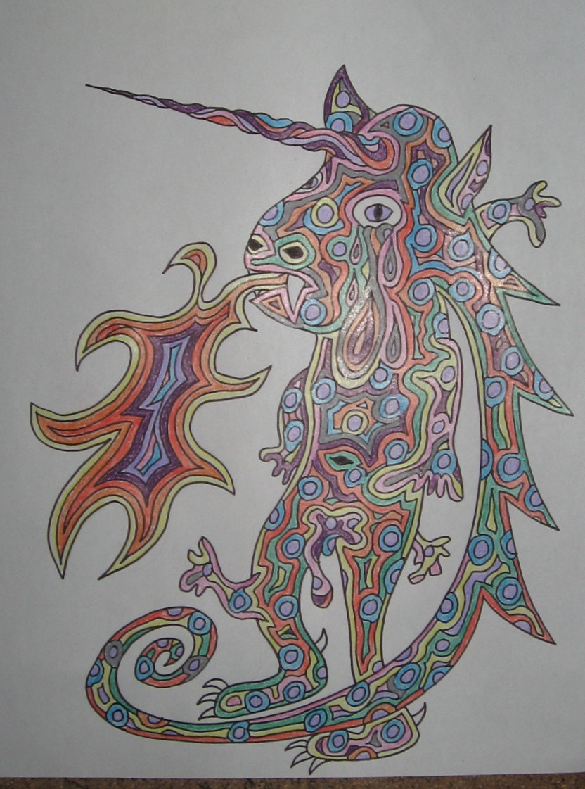 Dessin au crayon de feutre noir et crayons de couleurs.