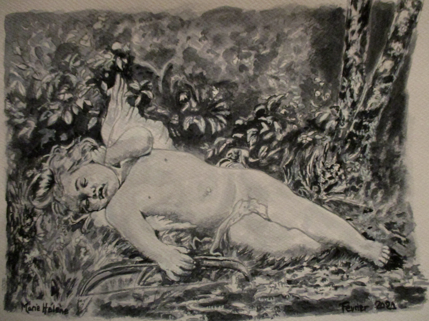 Aquarelle sur papier aquarelle - format 24 x 32 cm - Cupidon, fatigué d'avoir tiré ses flèches pour la Saint Valentin, s'est finalement endormi...Février 2021