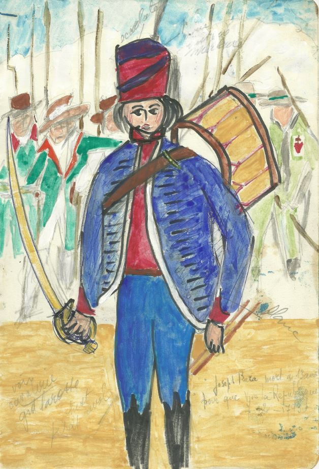 Joseph BARA jeune soldat de la République mort durant la guerre de Vendée en 1793 à 13 ans pour que vive la République Né à Palaiseau France Type : historique Crayon aquarelle Texier de Pélussin artiste peintre ( 1928 - 2008 )