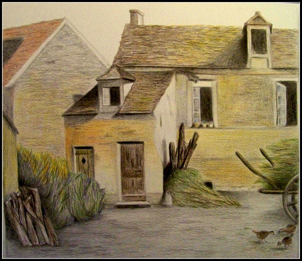 Une bien jolie petite cour de ferme ......Parfaitement dessiné et colorisé ....Une sérénité et une douceur de vivre émane de cette oeuvre qui sent bon la campagne d' autrefois .....Bravo marie-cé et à +++++ . Amitiés.