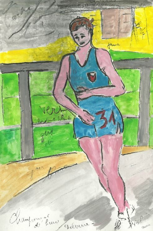 CHAMPIONNE DE L'HEURE à MONTEREAU Fault Yonne en Seine & Marne , unique en France la course à pied dite la "Course de l'heure " Type : portrait aquarelle Texier de Pélussin artiste peintre ( 1928 - 2008 )