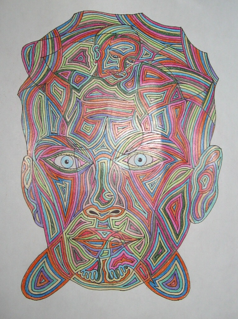 Dessin au crayon de feutre noir et crayons de couleurs.