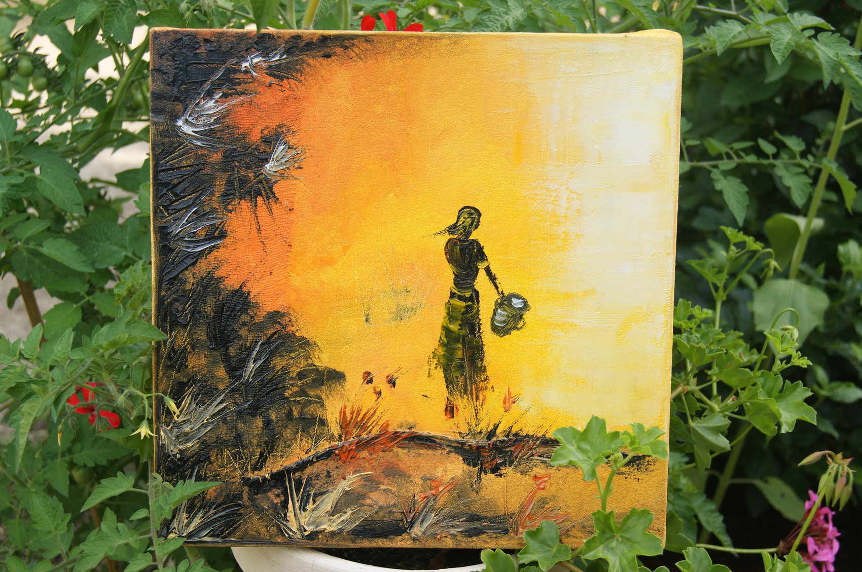 belle idée de présenter votre travail parmi les pélargoniums et les pieds de tomates!, je vous souhaite une belle récolte