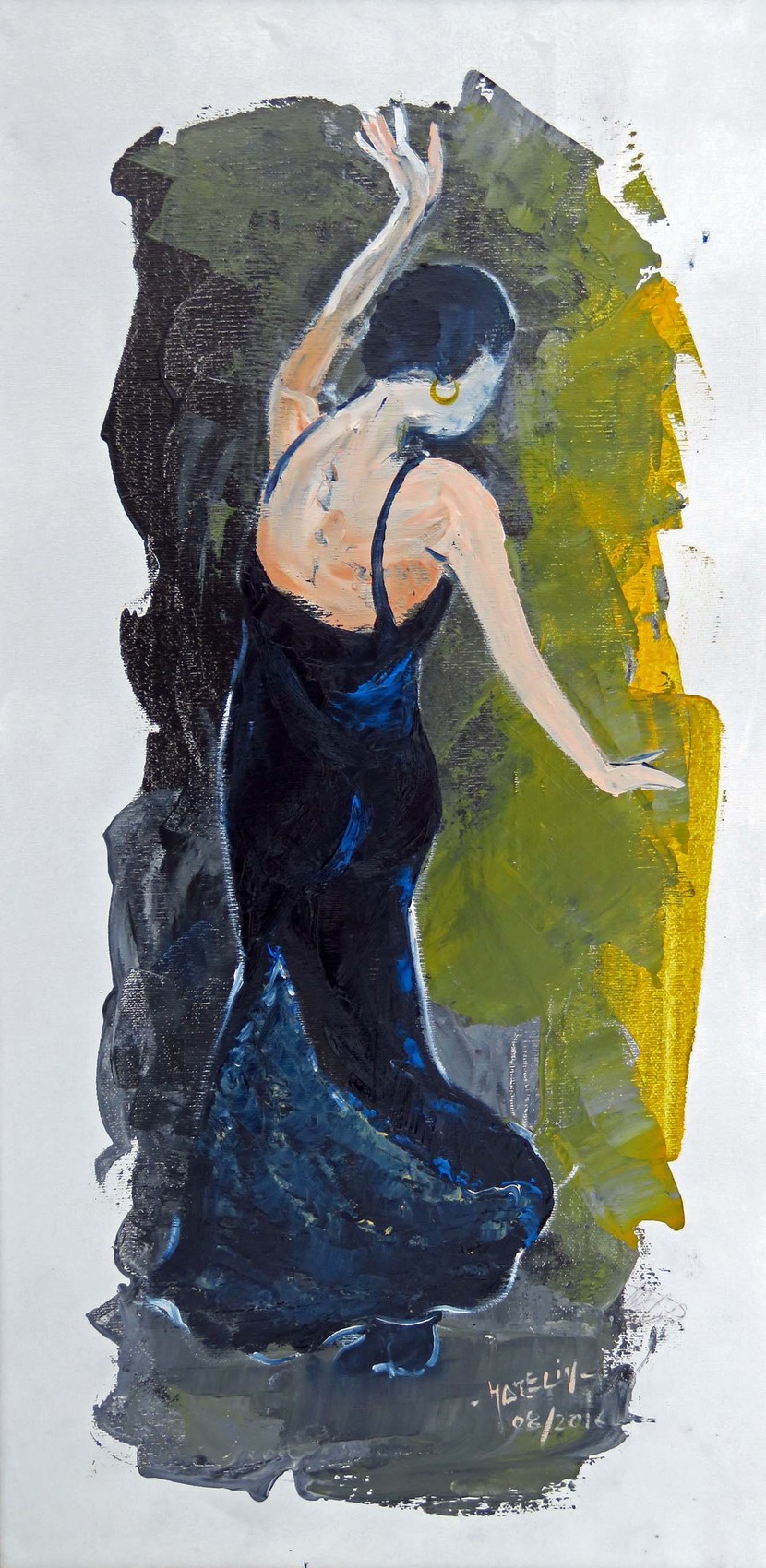 Huile et acrylique sur toile travaillée majoritairement au couteau ; œuvre unique de30x60 cm Dans le flamenco, la femme exprime à la fois sensualité, féminité mais aussi une force corporelle et puissante.