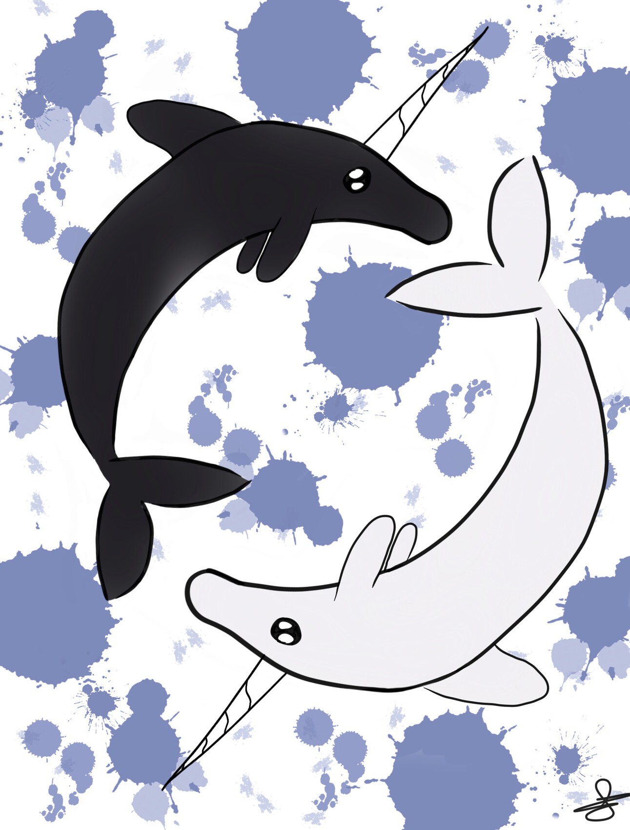 Dessin numérique fait sur l'application "Autodesk Sketchbook" de deux dauphins avec une corne représentant le yin et le yang. Fait en 1 heure.