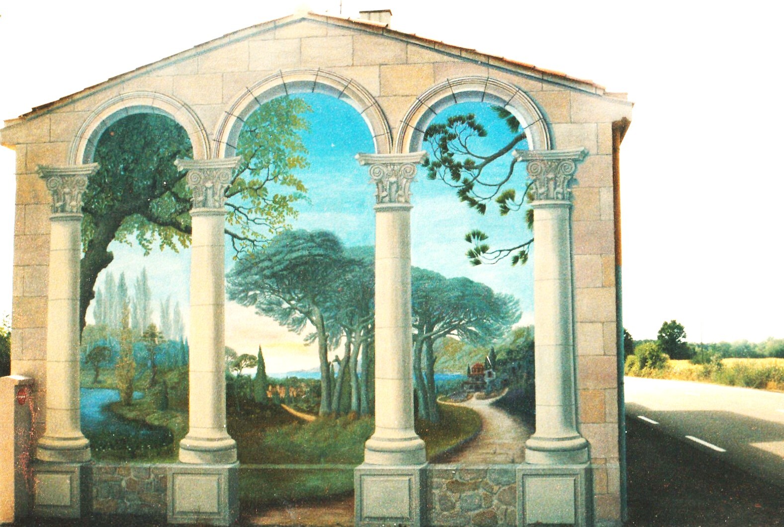 j'ai peint sur le pignon d'une école en vendée a AIZENAY un decor paysage du sud hauteur 5m largeur 12m