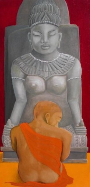 N°0072 HUILE SUR TOILE 120X60cm Année 2006 La sculpture en second plan est la représentation d’une déesse Cham. Ce groupe ethnique peuplait le royaume de Champa du deuxième au neuvième siècle. Il lutte pendant un millénaire avec les khmers et les vietnamiens, sa religion et ses croyances furent réduites à néant pour laisser place au bouddhisme. C’est la raison pour laquelle l’homme représenté de dos, tourne la tête à cette divinité. Si j'ai peins cet homme légèrement dénudé, c'est pour