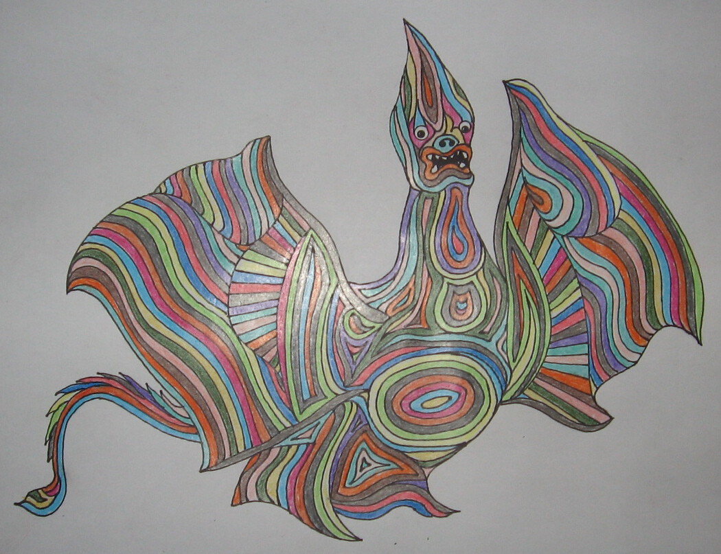 Dessin au crayon de feutre noir et crayons de couleurs.