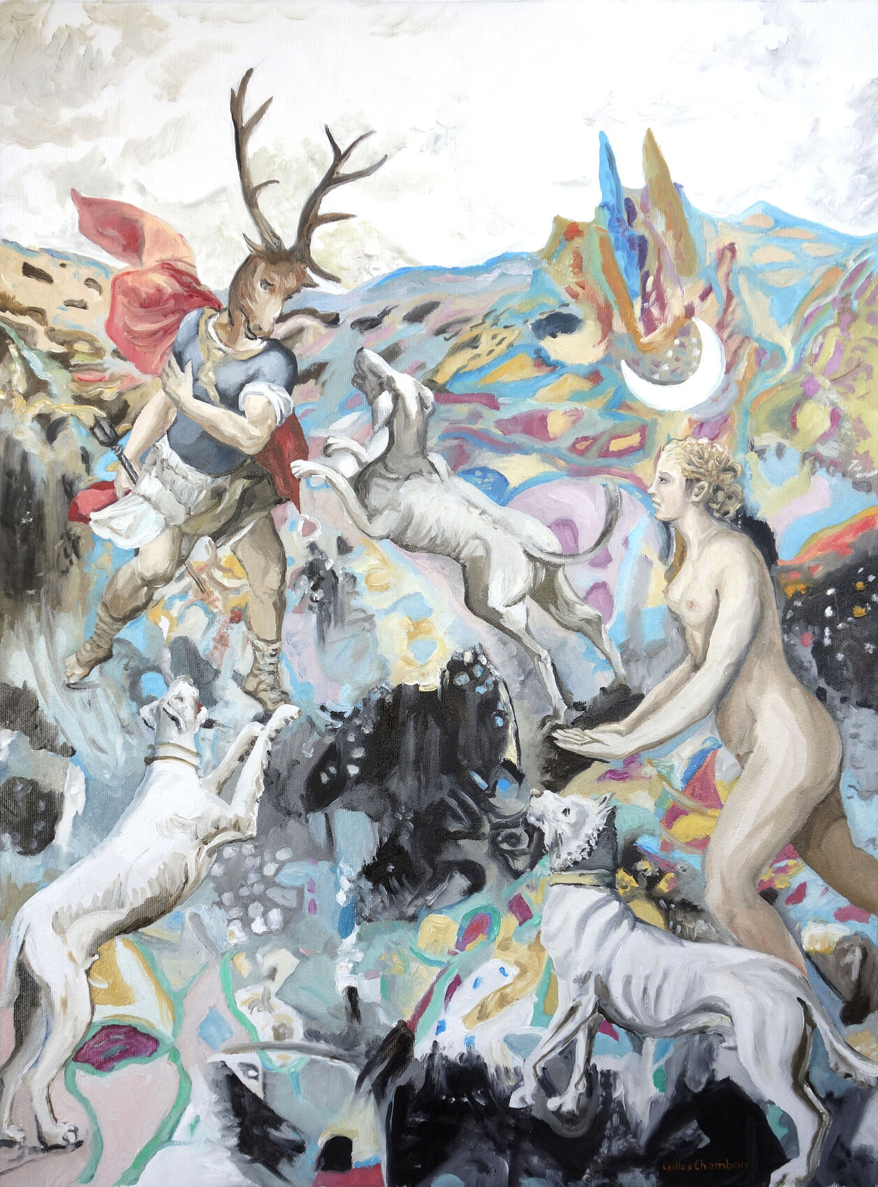 HST 73x54cm, 2024. Actéon transformé en cerf et dévoré par ces chiens : Sartre y avait vu une sorte de complexe du savant, qui viole de son regard le mystère universel. Ce pourrait être aussi une préfiguration de la violence révolutionnaire : la Terreur chasse et tue, avant qu'elle se décapite elle-même dans l'engrenage fatidique de l'idéologie révolutionnaire. Synchronistiquement impliqués dans ce tableau : Cavalier d'Arpin, Parmesan, et C. Maréchal (1925-2009).