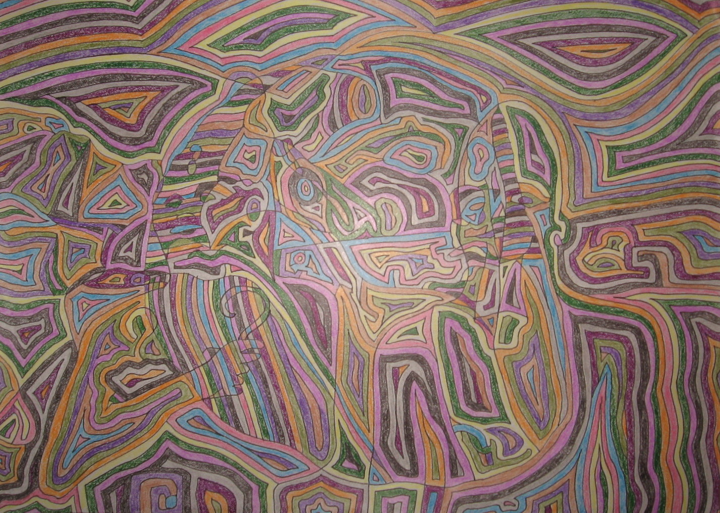 Dessin au crayon de feutre noir et crayons de couleurs.