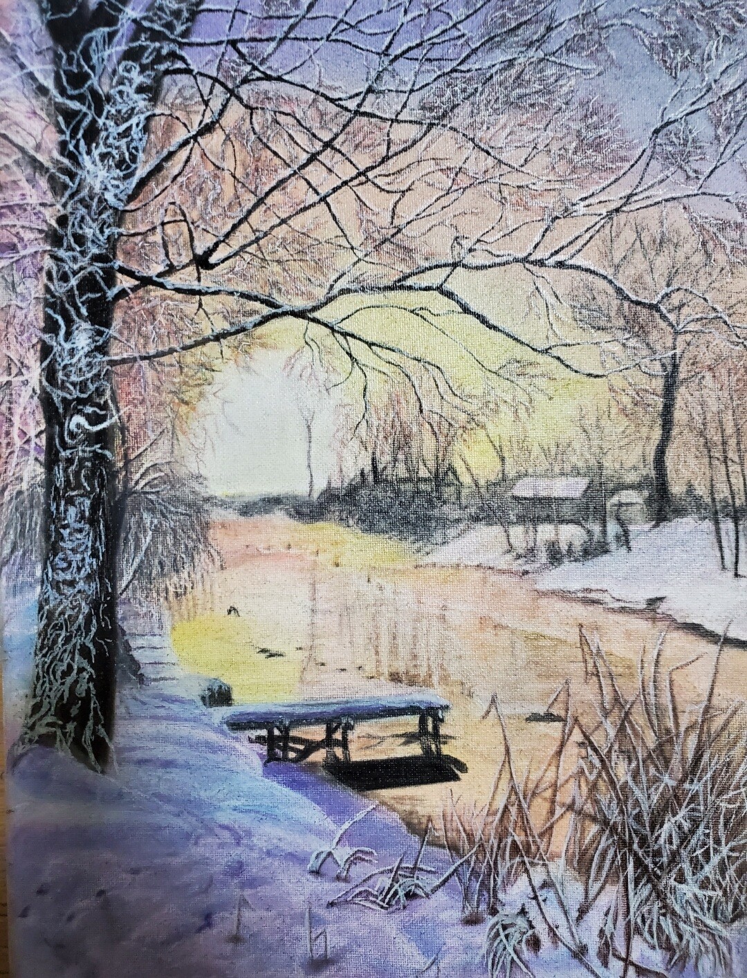 Le rendu de la neige qui vient de tomber est superbe, votre peinture acrylique est superbe ! Bravo