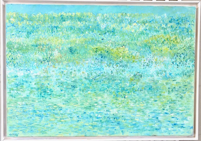toile coton travail mpoinceau et couteau superpôsition de tonalité verts, jaunes et bleu. J'ai souhaite confondre et harmoniser l'eau le végétale, la lumière. Cette toile est apaisante produisant un sentiment de délicatesse Dimension 124x85