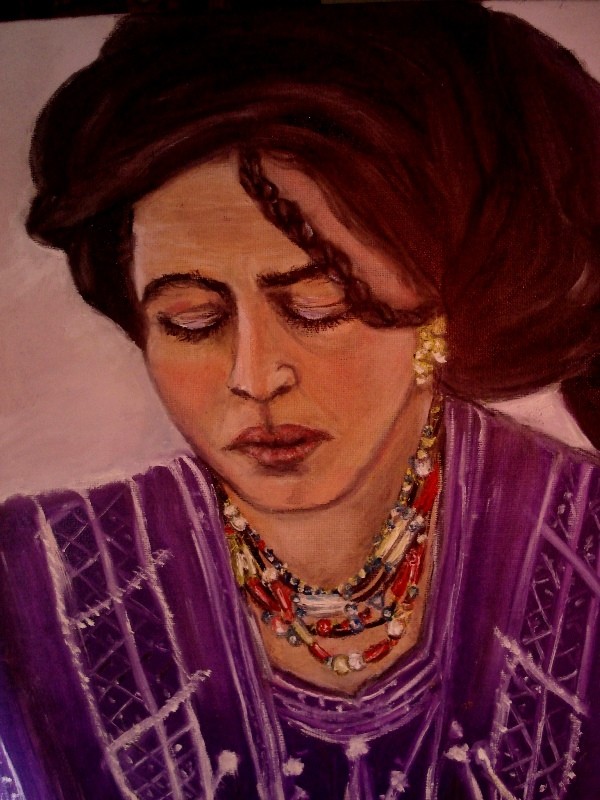 Douleur muette.Huile sur toile.40 sur 50. El targuia ou femme bleue est une femme très forte elle assume de grosses responsabilités, accouche sans aide médicale…Marche à pied sous un soleil torride… Très jeune on forge son caractère et on lui apprend selon l’expression locale « à avaler la douleur » c’est cette souffrance contenue cette douleur muette que j’ai tenté d’exprimer