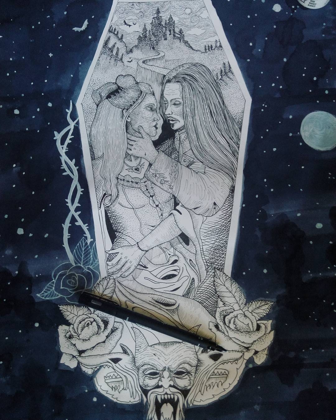 Travail en cours, fond en nuances d'encre aquarelle "bleu nuit" et étoiles,rose et ronces en encre blanche. Dessin au stylo " uni pin - fine line " en 0.5 / 2 / 4. Etant une fervente admiratrice du mythe vampiresque je me suis Inspirée du film Dracula de Francis Ford Coppola, 1992 lui même inspiré de l'oeuvre de Bram Stoker. Encore beaucoup de mal pour les visages et les mains. Technique maitrisée et utilisée : - pointillisme aussi appelé "dotwork" avec laquelle je suis plutôt à l'aise