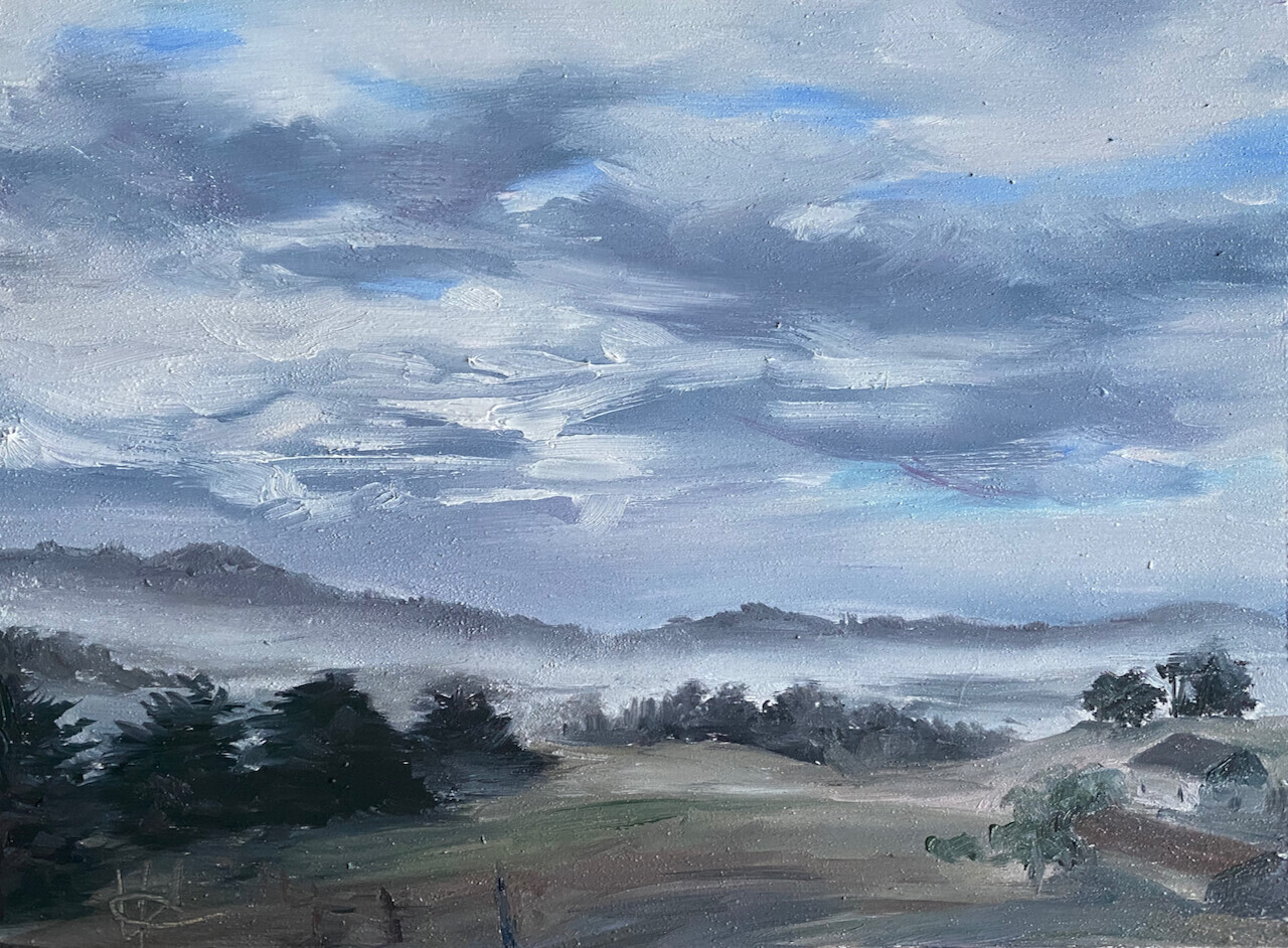 J'ai pris cette photo un matin de l'automne dernier dans notre belle Drôme des collines :-) Le soleil qui filtrait à travers les nuages se reflétait dans la brume... La luminosité qui émanait de l'ensemble du paysage était impressionnante. C'était d'une beauté incroyable ! J'ai essayé de la rendre avec mes pinceaux, mais forcément, ce n'est pas pareil... Exposition sur la Drôme des collines en cours...