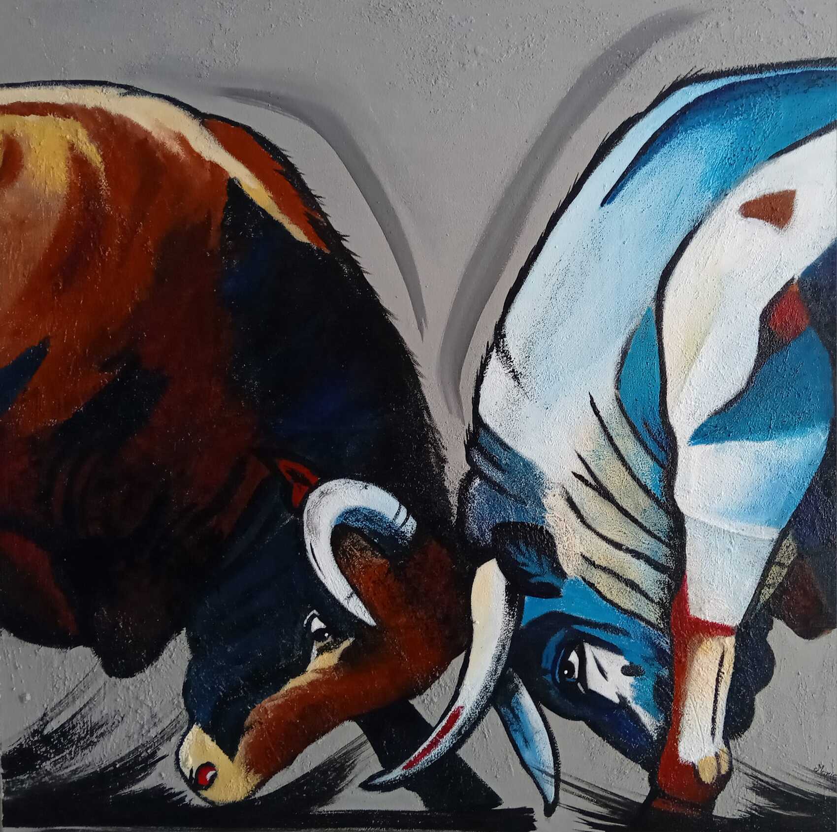 "Duel" Acrylique et matièrage 80.80 cm châssis 3d