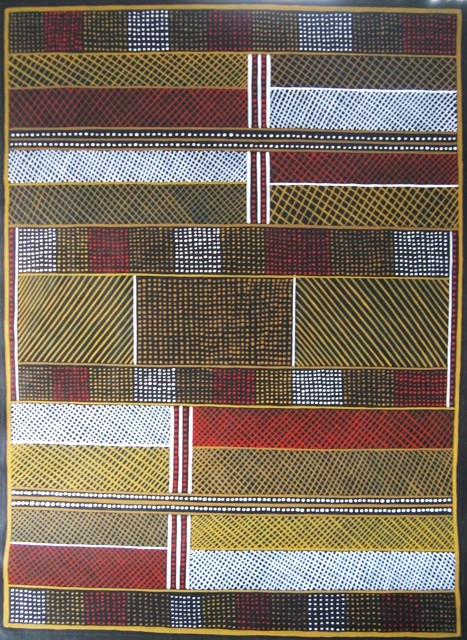 acrylique sur toile de lin 100x73 inspiré par les peintures sur écorce dans les territoires du nord de l'Australie