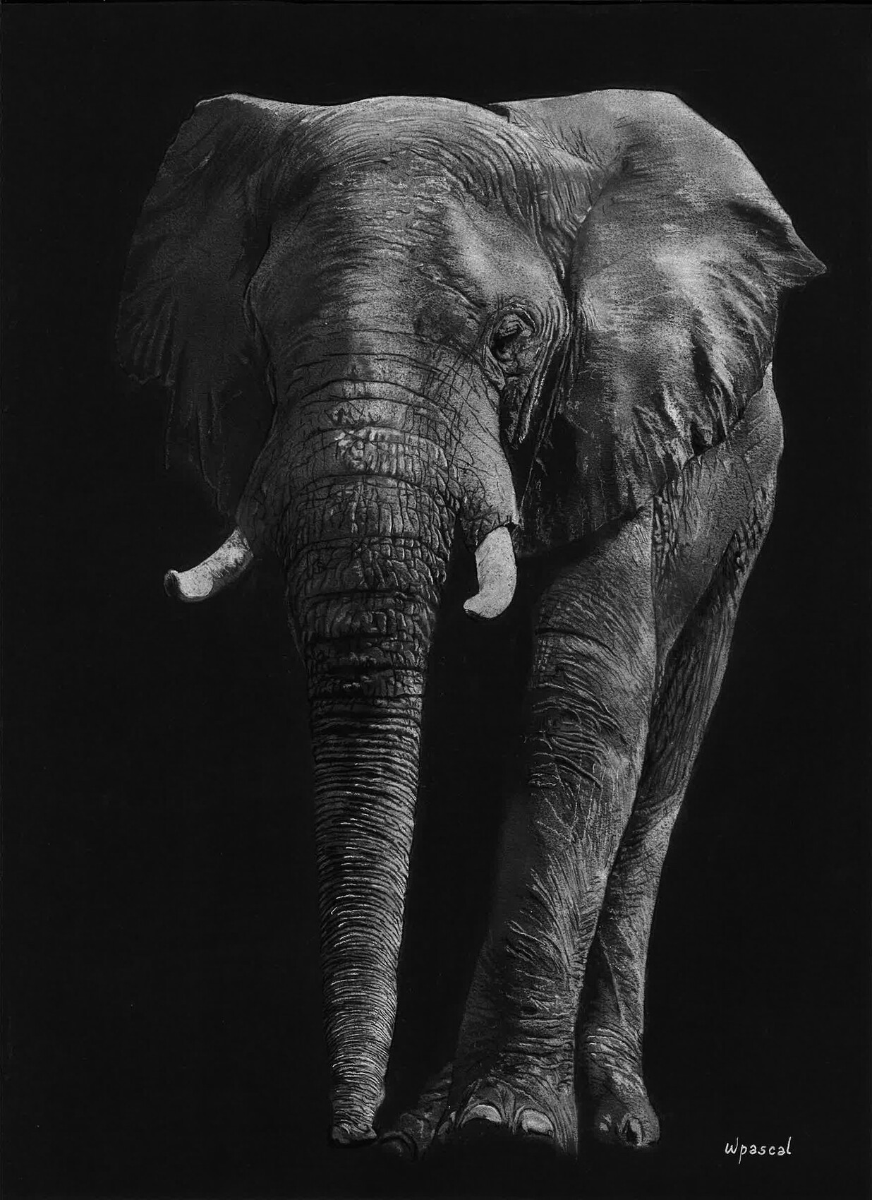 Depuis la mise à jour leur liste rouge, jeudi 25 mars 2021, les éléphants d’Afrique des savanes et des forêts, jusqu’ici jugés « vulnérables », sont désormais considérés « en danger » et « en danger critique » d’extinction par les experts de l’Union internationale pour la conservation de la nature (UICN). Pastel sur papier noir.
