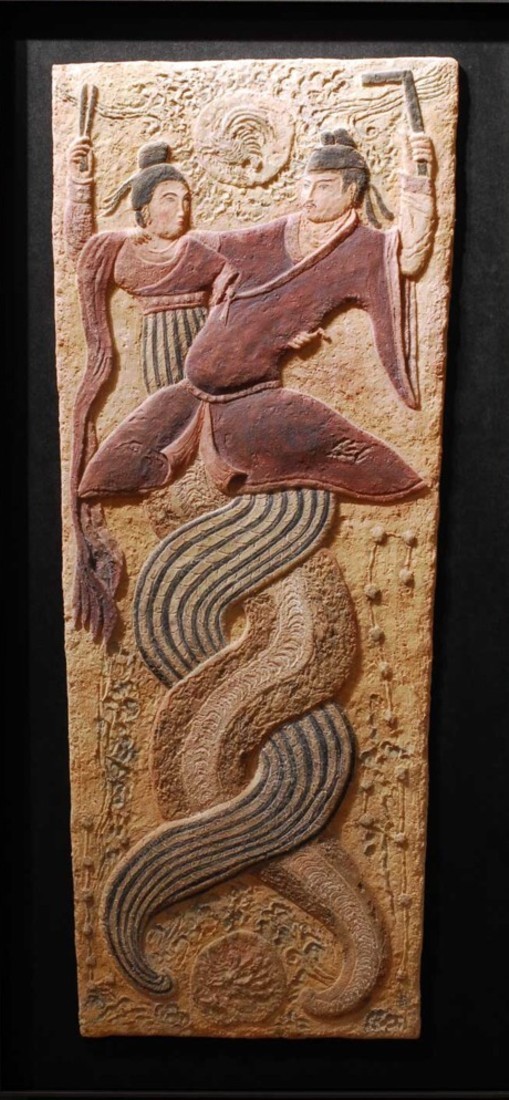 Recreación de una pintura de la dinastía Tang. Fue este periodo (618-906) una de las épocas de mayor esplendor en la historia de China. La imagen, hace referencia a Fu Xi y Nu Wa, emperadores míticos padres de la Creación, ya que ella porta un compás y el una escuadra. Se puede apreciar en el fondo unas constelaciones y un simbolo de era zodiacal. Sus cuerpos se entrelazan sutilmente ofreciendo una energia dual a todo lo manifestado.