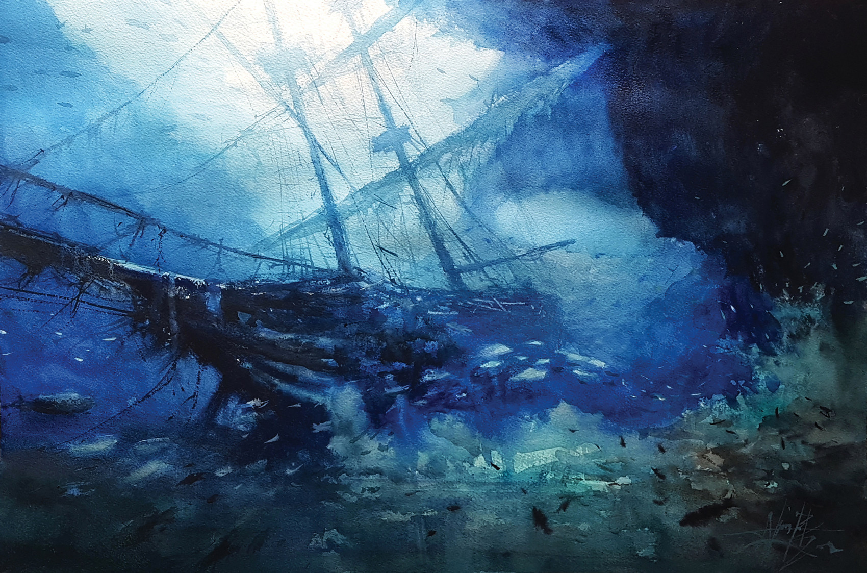 Aquarelle sur papier -- 46x61cm -- 2017 Création d'environnement sous marin sur la série d'épaves de navires. Des géant d'autrefois enfouis dans l'océan. L'idée étant de recréer l'ambiance sous marine avec un traitement de lumière en clair obscur, ainsi que du mouvement grâce aux poissons. Un cadrage cinématographique en contre plongée a été apporté à la scène afin de renforcer l'aspect de grandeur et d'immersion sous l'eau. #Aquarelle #Peinture #Navire #Océan #Plongée #SousL'eau #Alexis L