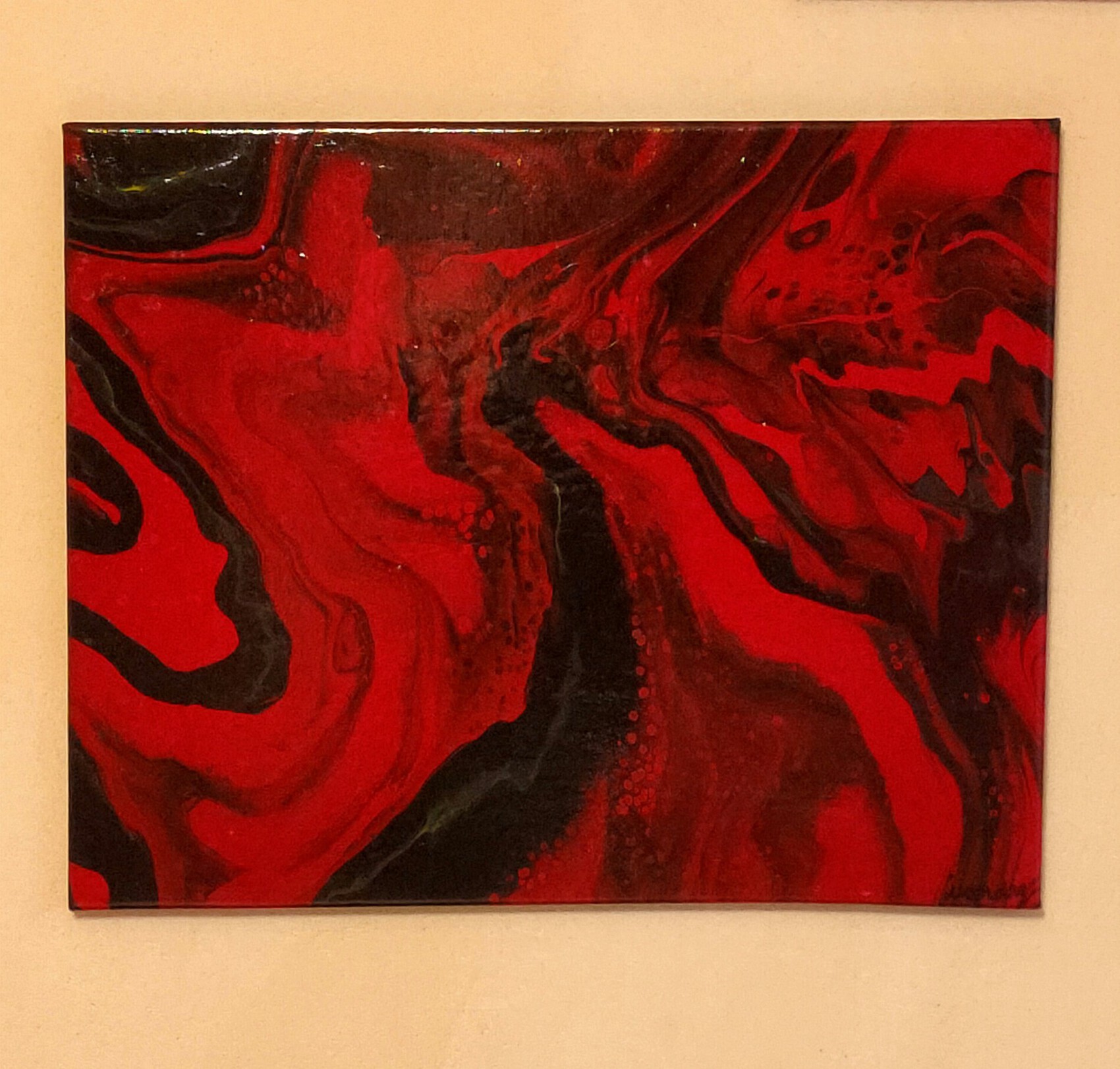 Acrylique pouring - noir et rouge - finition vernis brillant Châssis sur toile Dimensions : 50 x 40 cm