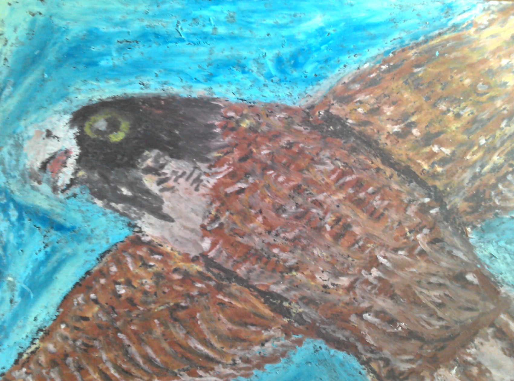 Faucon aux pastels à l'huile sur papier. Format carte postale.