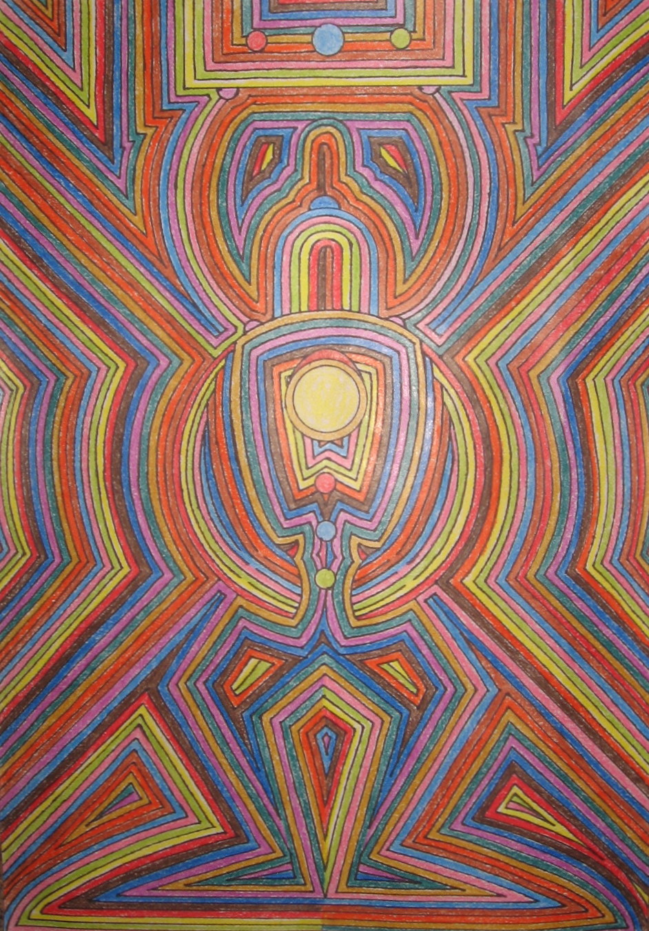 Dessin au crayon de feutre noir et crayons de couleurs.
