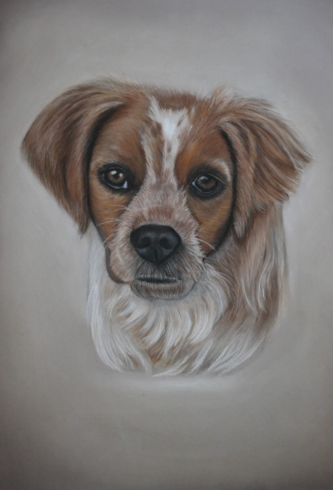 Epagneul breton réalisé aux crayons pastels secs fabercastell, derwent, carandache et carbothello sur papier pastelmat au format 24x30 cm