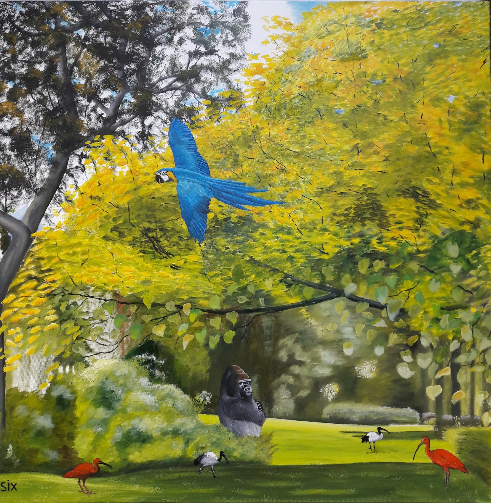 Un joli tableau très lumineux qui invite au voyage. Les jeux de lumière entre les arbres, les feuilles et la pelouse donnent une clarté très particulière à ce tableau. Les oiseaux animent le paysage avec grâce et légèreté. Et ce gorille au centre est-il le point d'orgue de l'histoire de cette toile ? Tout ceci est très mystérieux. Encore une jolie toile qui vient compléter cette belle galerie.