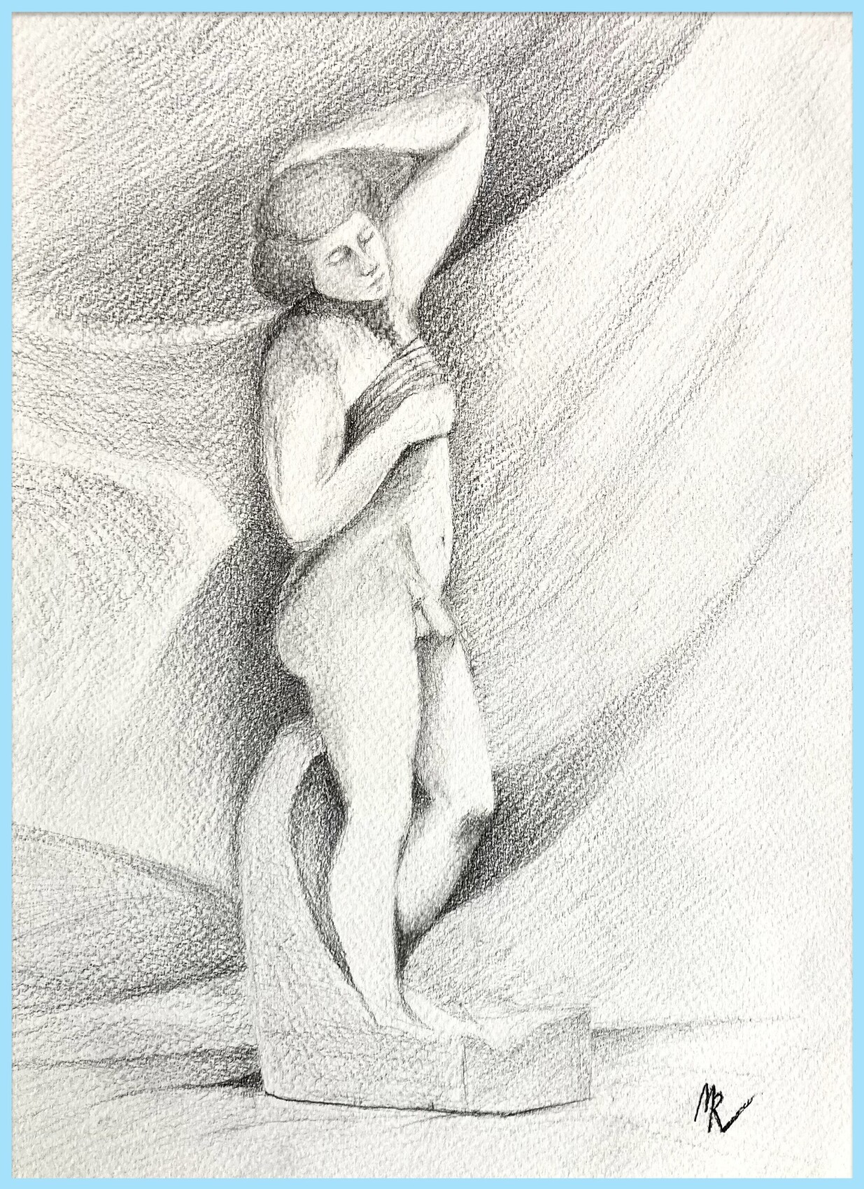 Crayon, février 2014, 32 x 24 cm. Statue située dans la galerie Michel-Ange du Louvre = Muriel Reulet = Pencil, 2014. Statue in the Louvre's Michelangelo gallery.