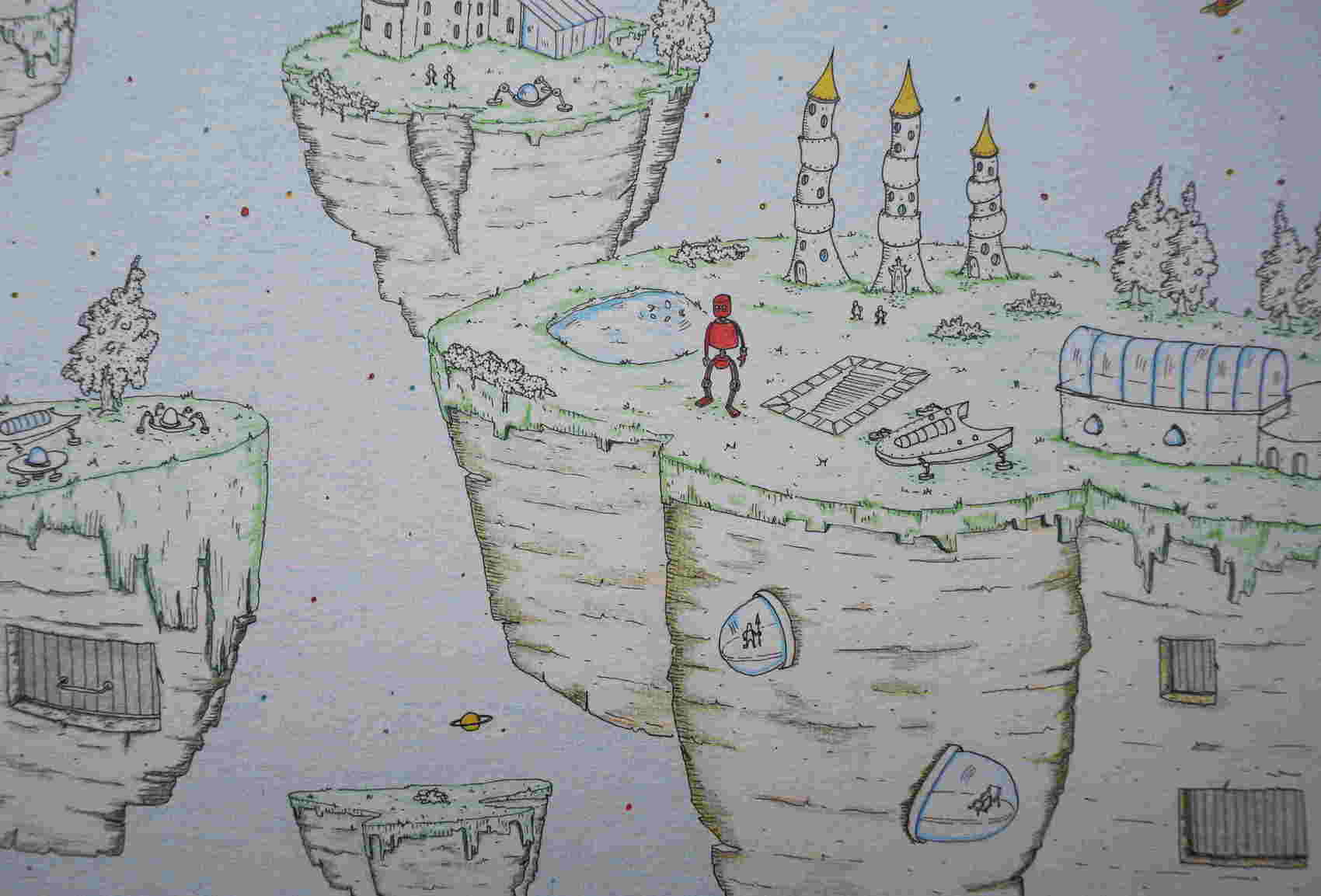 Tout est dans le titre. Pour le coté dessin, c'était, à l'origine, pour habillé les murs des chambres de nos petits bambins. L'idée première est arrivée quand la fille d'une amie m'à demandé un tableau pour sa chambre. Elle le voulait coloré, la vie dans l'espace, avec des robots et tout et tout....... Alors, prenant mon courage à deux mains, mon 2H dans l'une, ma gomme dans l'autre, en AVANT! Pour le coté technique, une autre fois hein?! on se capte comme dirait l'autre.