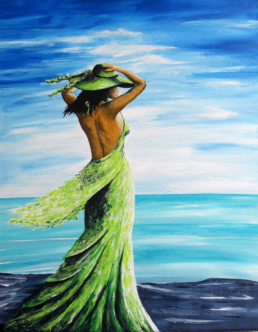 face à la mer,une belle femme couleurs des algues,qui doit certainement sortir du casino,et qui se dit pourquoi rester dedans,c'est tellement beau la mer et vivifiant .Belle toile,et bon dimanche Laurent.