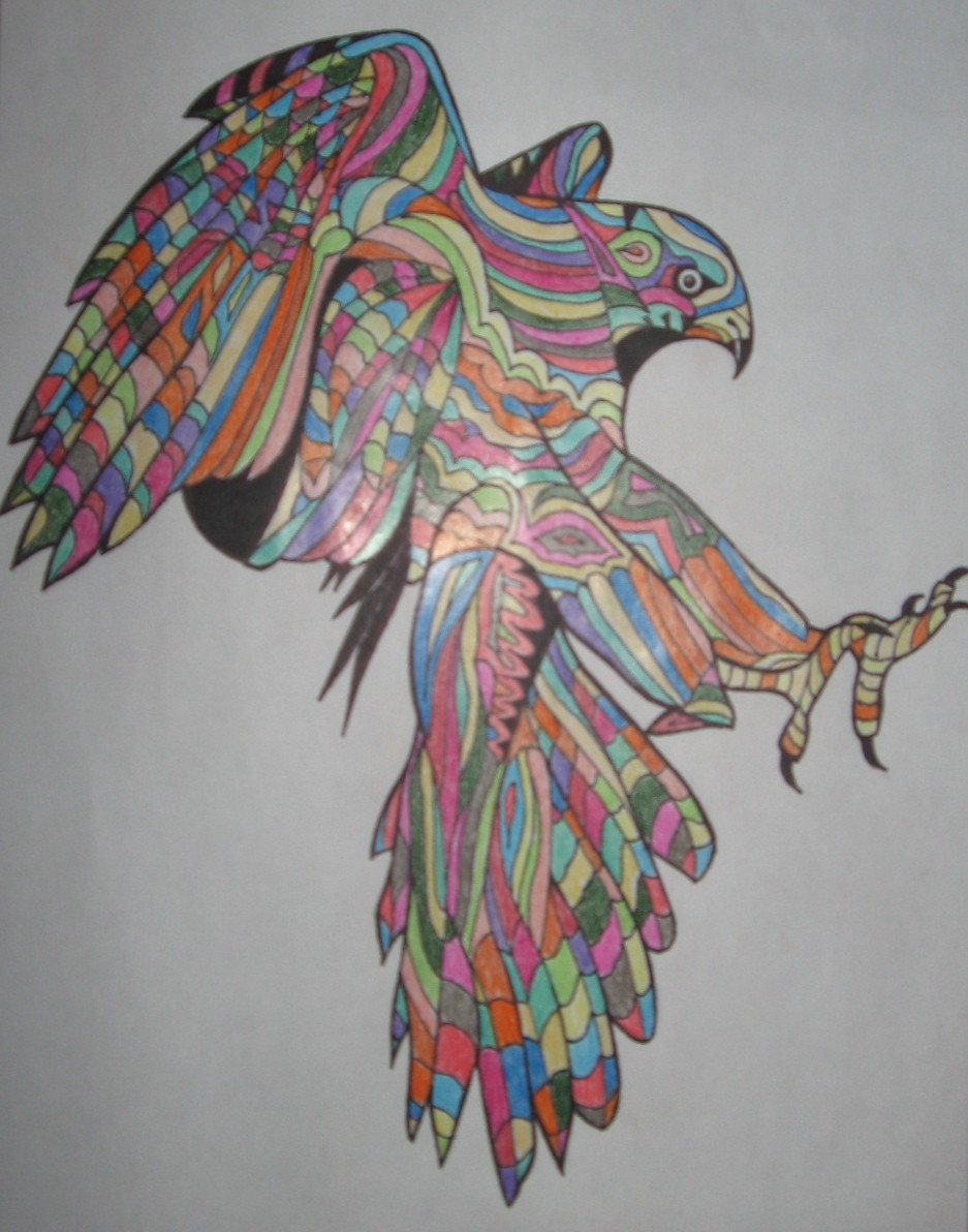 Dessin au crayon de feutre noir et crayons de couleurs.