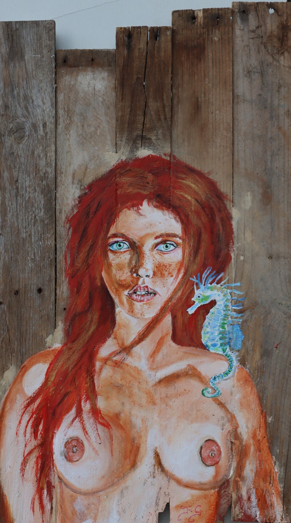 peinture sur bois de palette 43 / 60 série "femme et hippocampe JfG Jean-François Gantner