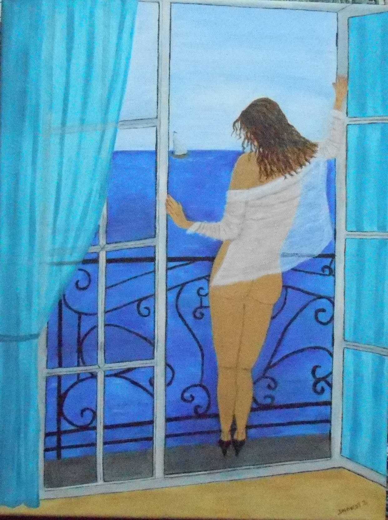 tableau peint à l'acrylique représentant une femme qui regarde par une porte fenêtre sur une toile de 40cm x30cm