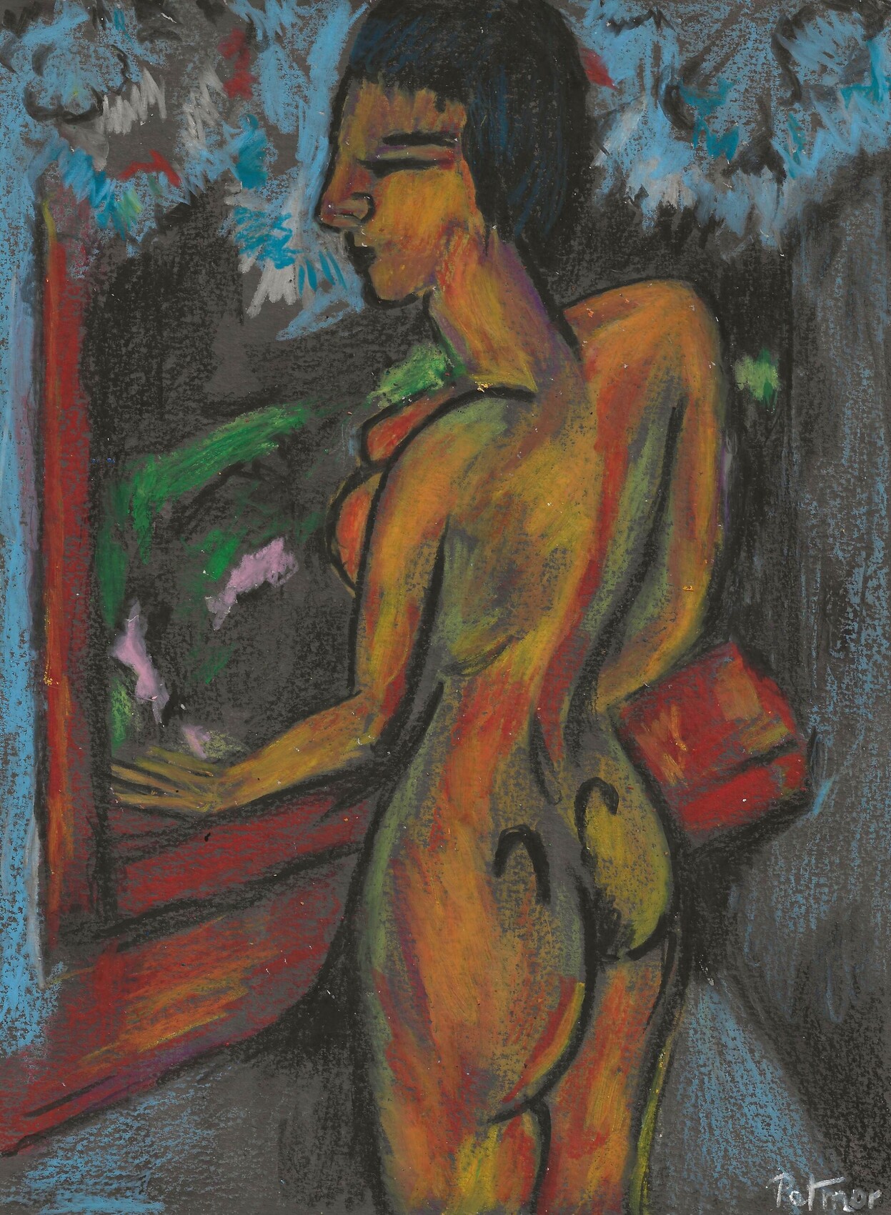 Craie à la cire sur papier 2022 interprétation du tableau de Ernst Ludwig Kirchner "À l'aube, je me suis levée pour regarder par la fenêtre minuscule de quel gris était la pluie." Benoîte Groult