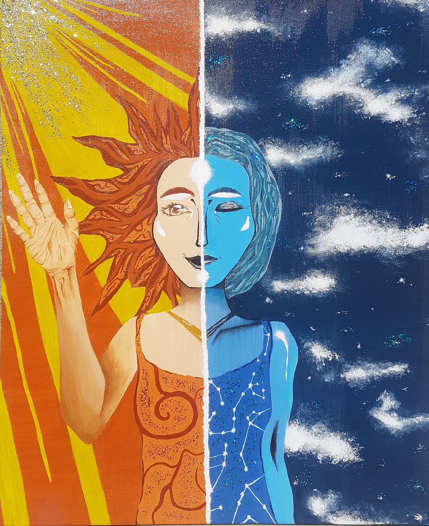 Chacun possède plusieurs personnalitées. Un jour heureux et chaleureux, et une nuit calme et paisible. Toile 57× 67 Acrylique + pailettes de couleurs