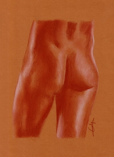 fesses de femme 160808, dessin flohic philippe , sanguine 610. papier Lana ocre 160 gr. format papier: 21 cm X 30 cm Dessin pur : 17 cm X 21,5 cm médiums: sanguine Conté 610, craie blanche