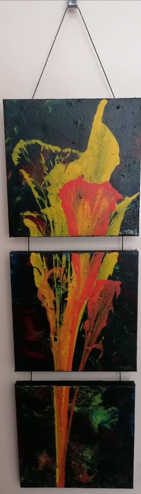 Peinture contemporaine abstraite – exemplaire unique Toile sur châssis (bords peints) – Œuvre originale signée sur toile et contre signée au dos Entièrement fait main - Mis en vente par l’artiste triptyque 3 fois 20 X 20 cm hauteur totale 66 cm