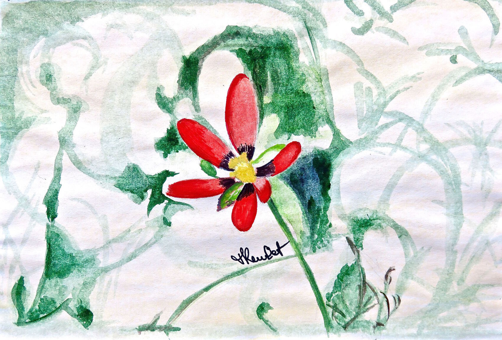 Aquarelle, juillet 2013, 14,5 x 21 cm. Petite fleur rouge découverte lors de mes premières vacances dans le Queyras. Article sur mon blog Artnaturl. Muriel REULET === Watercolor, 2013. A little red flore I met during my first holidays in the Queyras area. On my blog Artnaturl, you can read the article about this work.