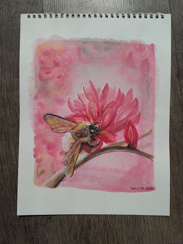 Un rendu de la profondeur particulièrement efficace. La netteté du butineur ne doit pas être facile à l'aqua. La fleur quelque peu stylisée (rodo ?) est très jolie. Oui, une belle aquarelle ! .