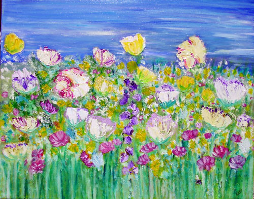escapade de fleurs. Ces fleurs libertines comme des jeunes filles se dispersent et cherchent aventure en se dressent au dessus des herbes. chassis cotons huile couteau 50X60