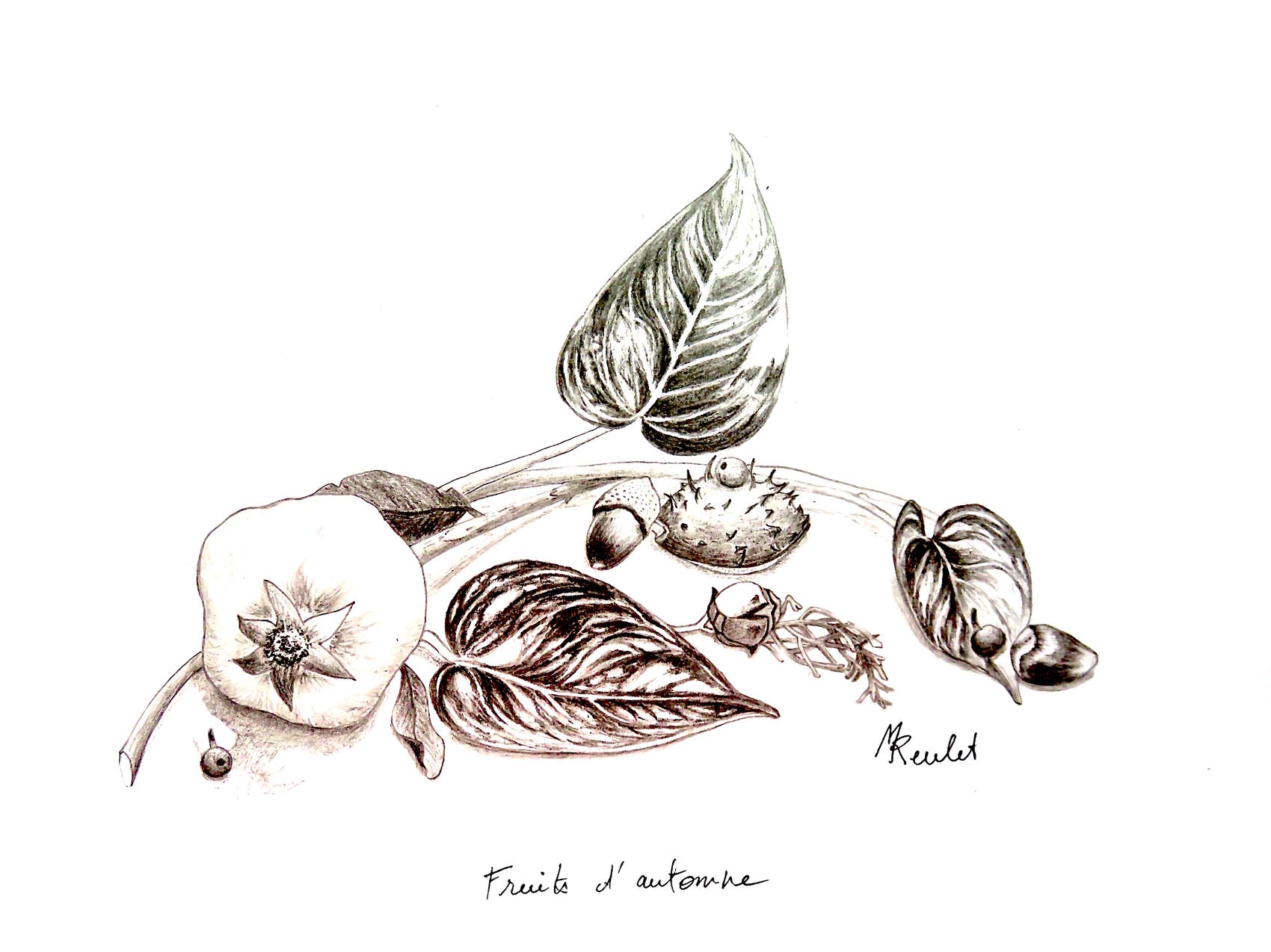 Crayon, septembre 2014, 23 x 32 cm. Composition florale personnelle dessinée d'après nature. Bogue, marron, gland, chêne, noisette, houx, cône, thuya, grenade. === Pencil, 2014. Life personal flower arrangement drawn from nature. Bug, chestnut, acorn, oak, hazelnut, holly, cone, thuja, pomegranate. === Muriel REULET Artnaturl